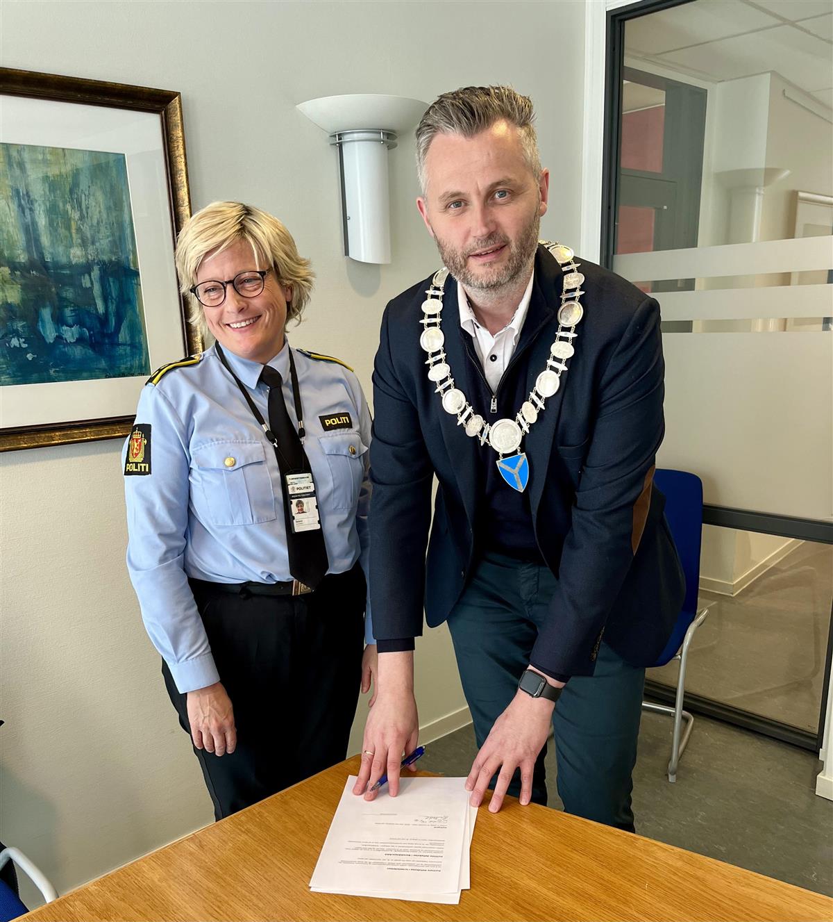 På bildet kan du se ordfører Per Sverre Kvinlaug og politistasjonssjef Liv Versland Seland signere avtalen.