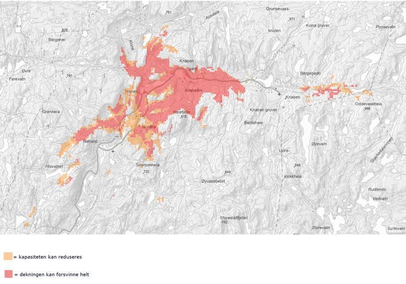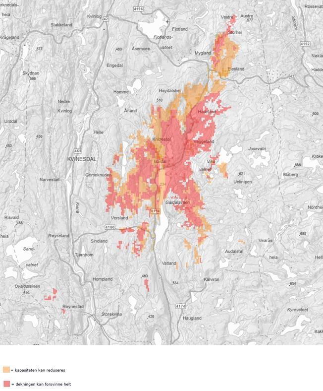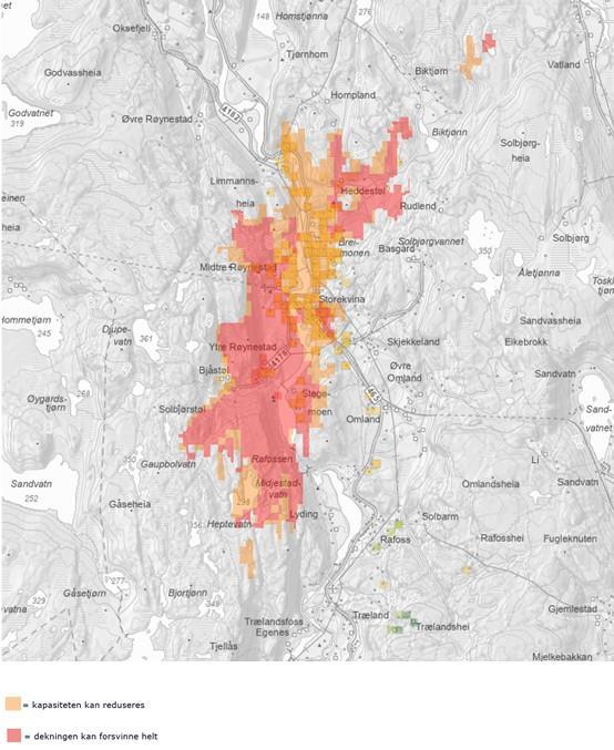 Under er et kartutsnitt av området som vil kunne oppleve periodevis redusert kvalitet eller manglende dekning i forbindelse med arbeidet.